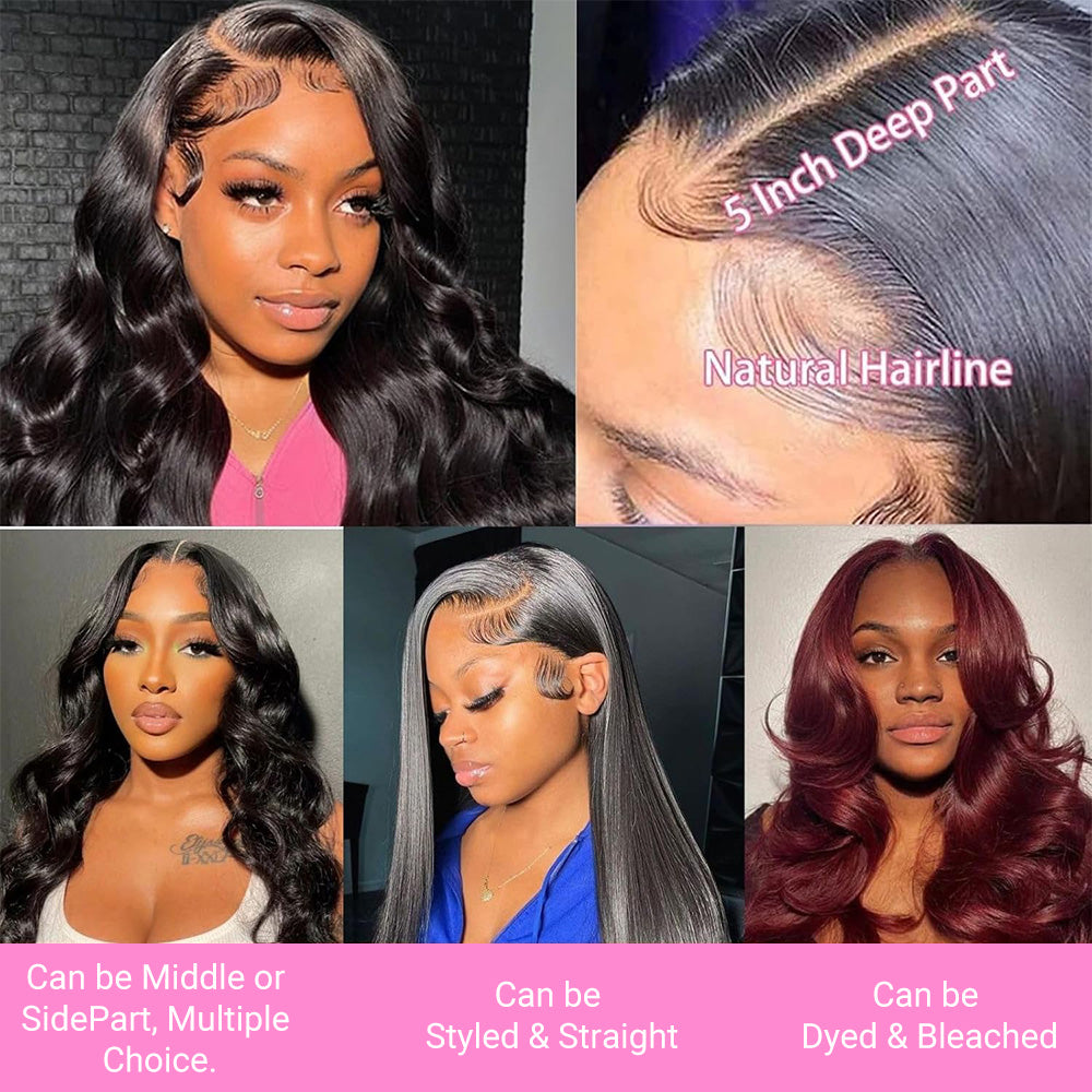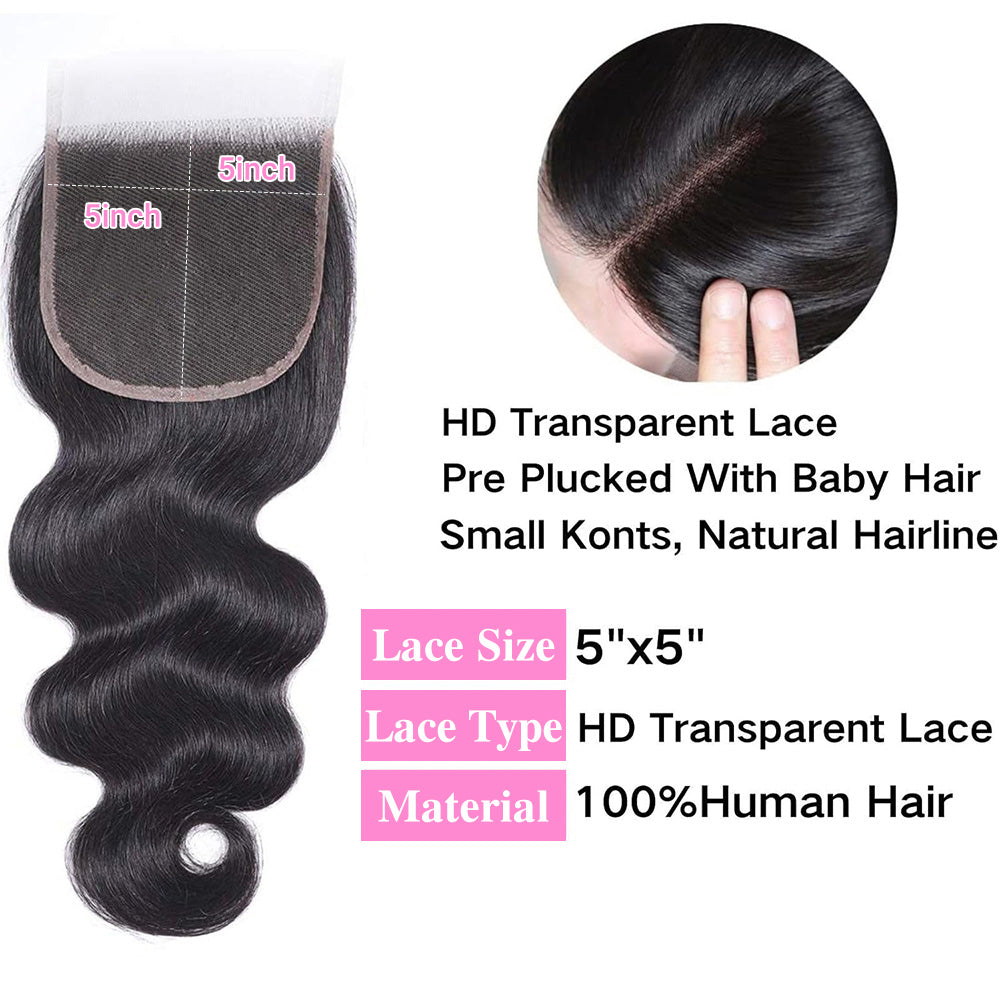 【5x5 Body Wave HD Lace Frontal Material】: 100% unprocessed human hair, soft and thick, no shedding and no tangle; Can be bleached, dyed, curled, and straightened.