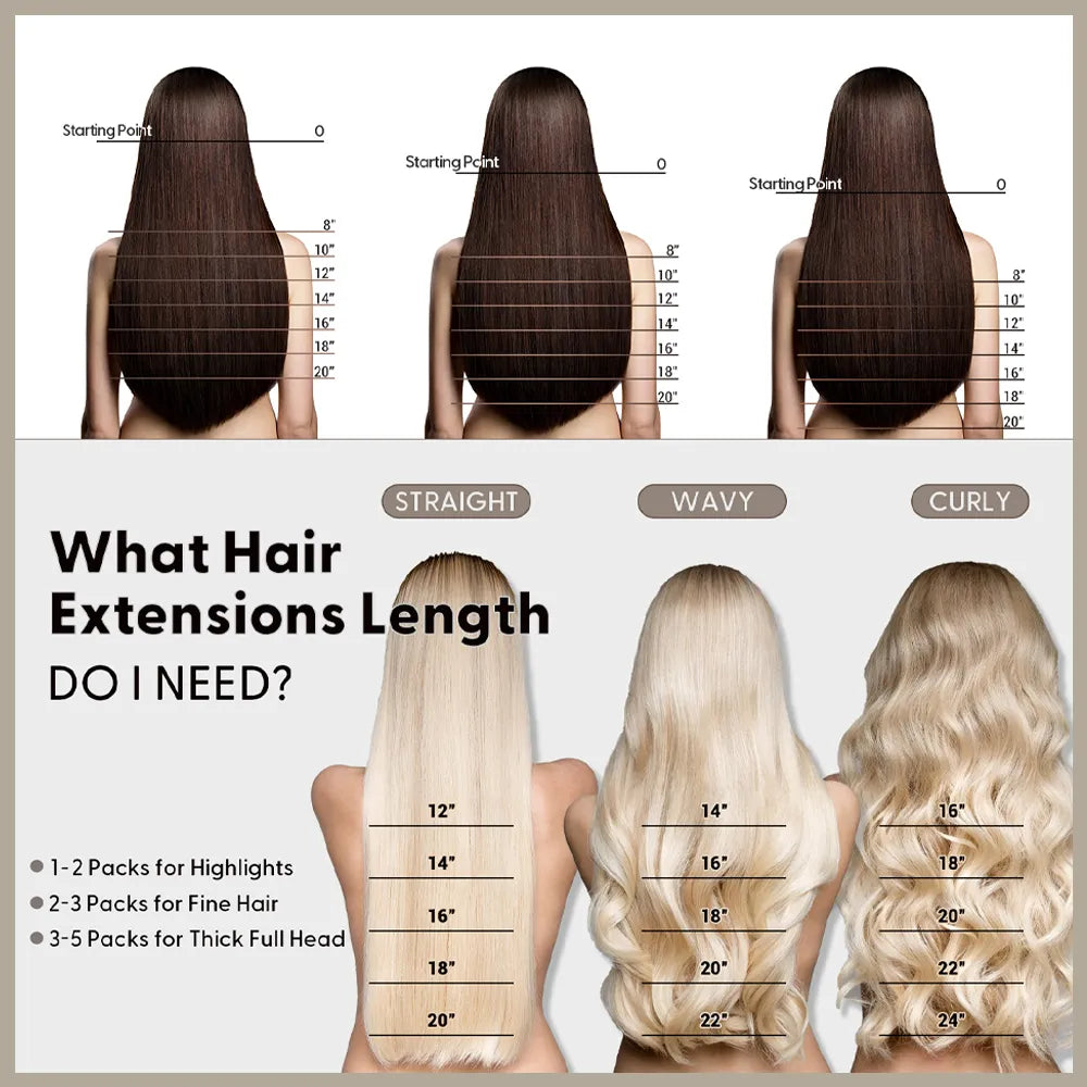 【Tape in Extensions Specification】20Pcs per pack; For thick hair, 3-4 packs for length and 2-3 packs for thickness; for thin hair, 4-5 packs for length and 3-4 packs for thickness; we recommend 3-4 packs of hair extensions tape in for a full head