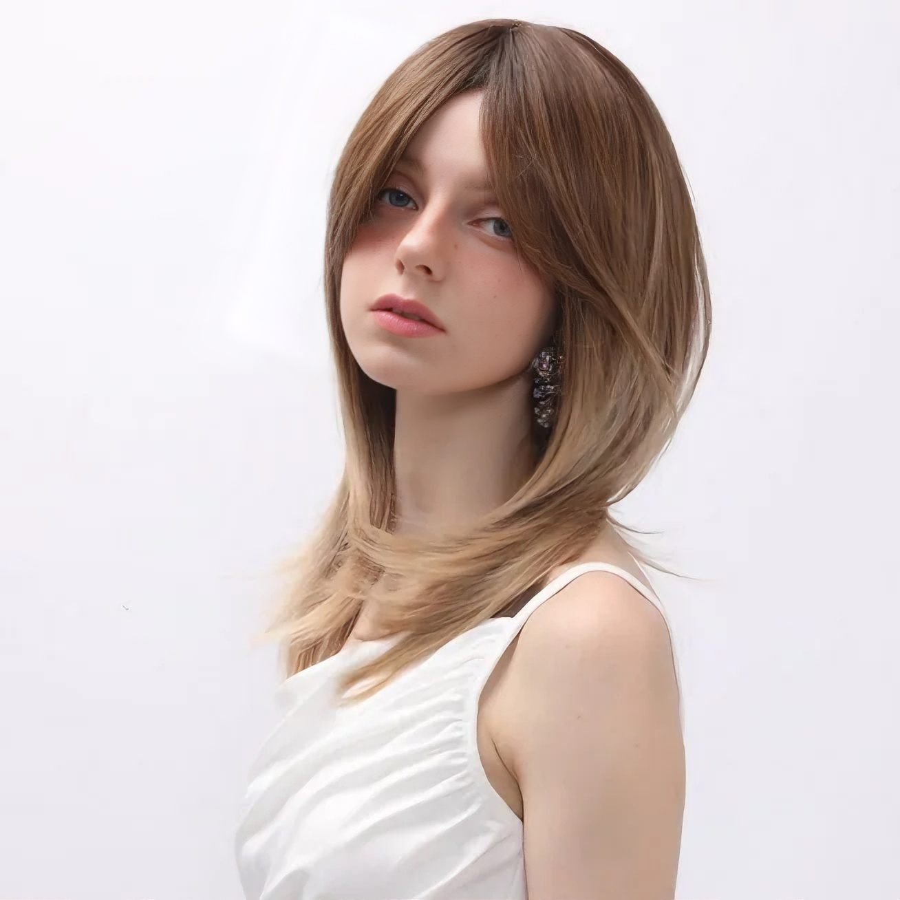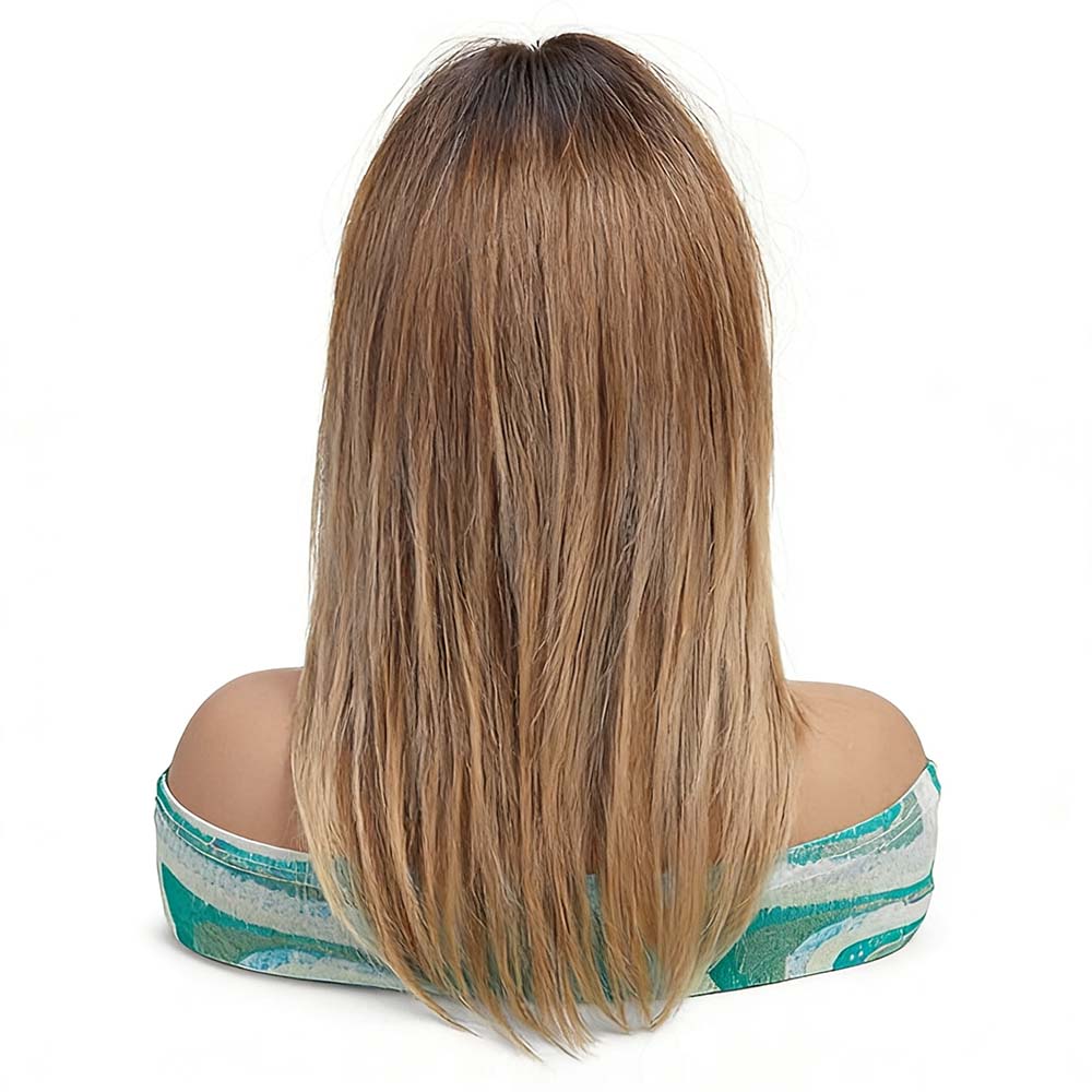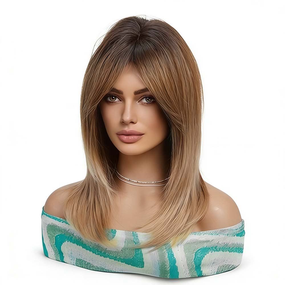 Warm Brown Wigs with Bangs for Women Natural Straight Ombre Brown Wigs Shoulder Length Glueless Natural Straight Full Synthetic Wig 14 inch
